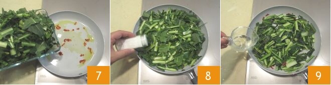 Deixe dourar por alguns segundos e adicione a chicória 7. Salteie por um minuto em fogo alto e, ao mesmo tempo, ajuste o sal e a pimenta 8. Em seguida, regue com o vinho branco 9 e cozinhe. Levará cerca de dez minutos.