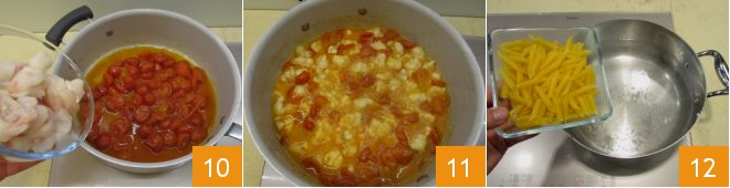 Adicione o tamboril cortado em pedaços 10 e continue cozinhando por mais 5 minutos para que o peixe também cozinhe 11. Enquanto isso, cozinhe as penne sem glúten por 9 minutos ou pelo tempo indicado na embalagem 12.