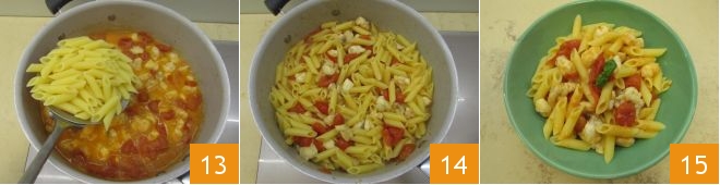 Quando a massa estiver cozida, escorra-a com uma escumadeira diretamente na panela com o molho de tomatinhos 13, misture para amalgamar o tempero 14 e sirva suas penne com tamboril e tomatinhos bem quentes 15.