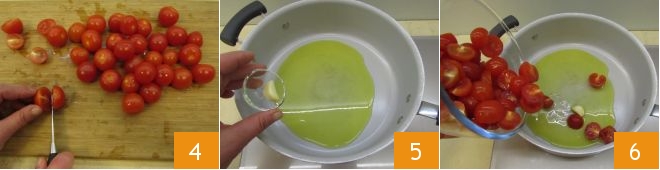 Lave os tomatinhos e depois corte-os ao meio 4, aqueça o azeite de oliva em uma panela e adicione o alho inteiro descascado 5. Deixe o alho dar sabor ao azeite e depois adicione os tomatinhos 6,