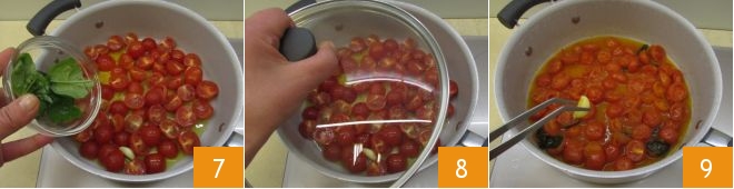 aromatize com as folhas de manjericão fresco 7, salgue, apimente, cubra com a tampa 8 e deixe cozinhar em fogo baixo por 20 minutos. Enquanto isso, coloque uma panela cheia de água salgada no fogo e leve-a para ferver. Uma vez fervida, salgue-a, pois servirá para cozinhar a massa. Após o tempo de cozimento dos tomatinhos, remova o alho 9