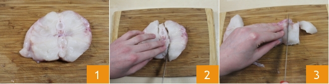 Para preparar as penne com tamboril e tomatinhos, consiga um ou mais pedaços já limpos de tamboril 1 e retire o osso central, cortando com uma faca ao redor do osso, tentando manter a carne intacta 2. Corte o tamboril em pedaços de 3-4 centímetros 3.