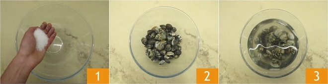 Para preparar as penne em barco, a primeira coisa a fazer é limpar as vôngoles: certifique-se de que não há conchas quebradas ou vazias, elas devem ser descartadas. Em seguida, bata-as contra a pia, ou eventualmente em uma tábua de corte. Esta operação é importante para verificar se não há areia dentro: os bivalves saudáveis permanecerão fechados, enquanto aqueles cheios de areia se abrirão. Coloque as vôngoles para purgar: em uma tigela grande, adicione o sal grosso 1 e as vôngoles 2, cubra com água 3 e deixe de molho por algumas horas.