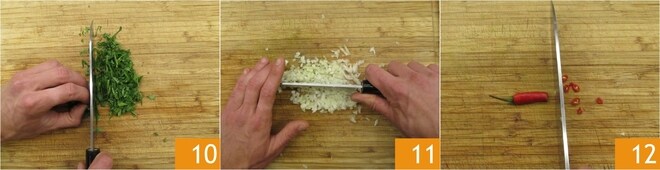 Agora pique a salsa 10 e reserve: será necessário para a mistura. Descasque e pique finamente a cebola 11, meio dente de alho sem o germe e a pimenta 12.