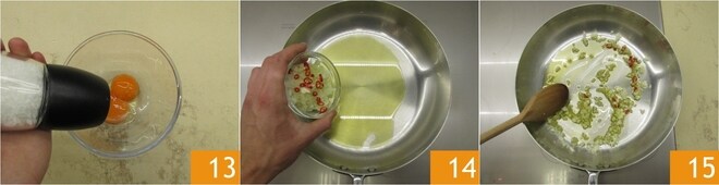 Separe as gemas das claras, adicione sal e bata levemente 13. Refogue em uma panela com óleo a cebola, o alho e a pimenta picados 14, bastarão alguns minutos em fogo médio-alto, o tempo necessário para murchar 15.