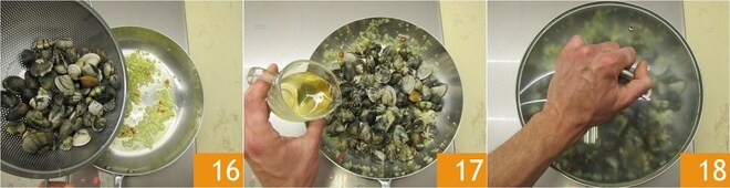 Adicione as vôngoles 16, despeje o vinho branco 17 e tampe 18. Cozinhe até que todas as conchas se abram. Enquanto isso, coloque uma panela cheia de água salgada para ferver.