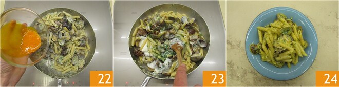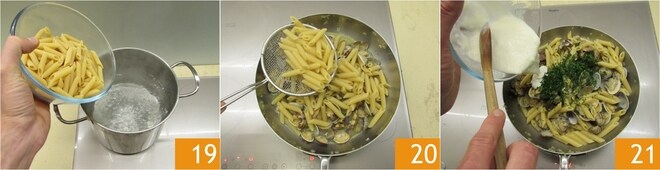 Cozinhe a massa 19 e escorra 3-4 minutos antes do fim do cozimento diretamente na panela com as vôngoles 20. Termine o cozimento na panela por 4-5 minutos, a massa deve absorver quase todo o suco liberado pelas vôngoles e começará a ter a cremosidade certa. Com o fogo desligado, com a panela ainda bem quente, adicione o molho bechamel 21.