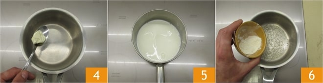 Enquanto isso, prepare o molho bechamel. Derreta a manteiga em uma panela 4, em outra aqueça o leite 5 e adicione uma pitada de sal. Quando a manteiga estiver derretida, adicione a farinha de uma vez 6 e misture com um batedor.