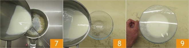 Uma vez obtido o roux, adicione o leite 7 e cozinhe por alguns minutos, sempre mexendo, até obter uma consistência lisa e homogênea 8. Reserve o molho bechamel em temperatura ambiente, coberto com filme plástico 9.