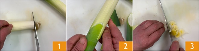 Para preparar as penne ao açafrão veganas, primeiro corte as raízes dos alhos-poró 1, retire a primeira camada mais dura 2, e depois corte-os em rodelas 3.