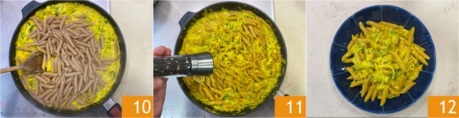 Misture para integrar os ingredientes 10 e finalize o cozimento, se necessário, adicione mais água de cozimento da massa. Ajuste o sal e a pimenta 11, e então sirva. As penne ao açafrão veganas estão prontas para serem apreciadas 12.