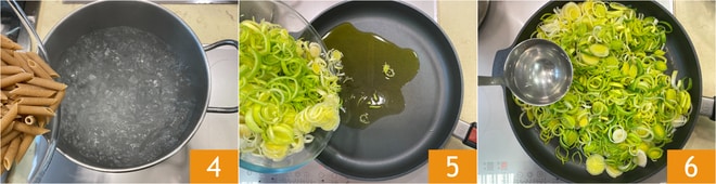 Cozinhe a massa em água fervente abundante e salgada 4 pelo tempo indicado na embalagem. Em uma frigideira, coloque o óleo, adicione os alhos-poró 5 e uma concha de água de cozimento da massa 6. Cozinhe por 10 minutos.