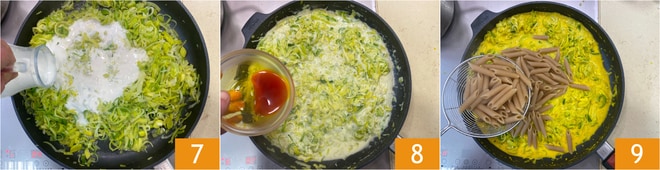 Despeje na frigideira o creme de soja 7 e continue a cozinhar por mais 5 minutos. Dissolva os pacotinhos de açafrão com uma concha de água de cozimento da massa, adicione aos alhos-poró 8 e misture. Escorra a massa al dente e transfira para a frigideira 9.