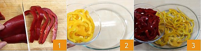 Para preparar os pimentões assados com alcaparras, comece limpando os pimentões vermelhos e amarelos: lave-os em água corrente, seque-os e corte-os ao meio no sentido do comprimento, removendo as sementes internas e o cabinho com uma faca afiada. Corte cada metade dos pimentões em tiras, com um corte transversal à parte longa. Pegue uma assadeira (você pode usar tanto de vidro quanto de cerâmica) e coloque dentro os pimentões amarelos 2 e vermelhos 3 cortados em tiras.