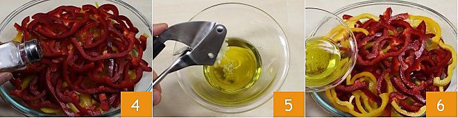 Salgue os pimentões 4 e prepare o tempero: em uma pequena tigela, coloque o óleo e incorpore o alho picado 5 (você pode usar um espremedor de alho ou picar o alho com uma faca). Despeje a emulsão de óleo aromatizado com alho na assadeira 6 e misture bem para que os pimentões fiquem bem temperados.