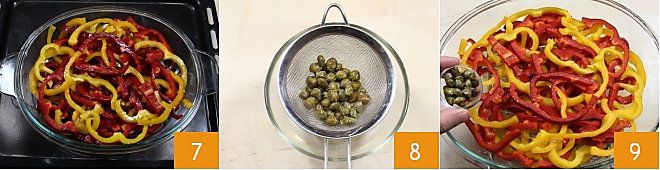 Asse os pimentões com alcaparras a 180°C por cerca de 30 minutos em forno estático pré-aquecido 7. Enquanto isso, escorra as alcaparras da água 8, e uma vez concluída a cocção, retire os pimentões do forno e adicione as alcaparras 9 apenas agora para que preservem seu aroma. Coloque novamente no forno, ainda a 180°C, a assadeira com os pimentões e as alcaparras por mais 5 minutos, retire-a