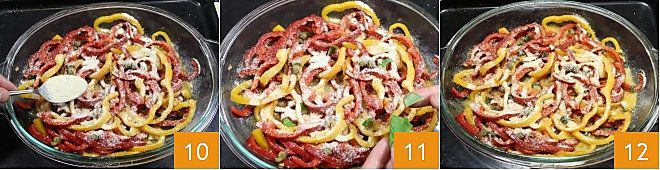 polvilhe a superfície com a farinha de rosca 10, adicione manjericão fresco picado com as mãos 11 e misture bem. Coloque novamente no forno sempre à mesma temperatura 12 e deixe gratinar até que uma crostinha se forme nos pimentões. Retire a assadeira de pimentões assados com alcaparras e aguarde alguns minutos para que esfrie um pouco antes de servir à mesa.