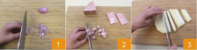 Para preparar os pimentões recheados com arroz, comece preparando um Caldo de legumes com a nossa receita. Pique finamente a cebola 1 e corte a mortadela em cubinhos 2. Corte também o queijo caciocavallo, primeiro em tiras 3