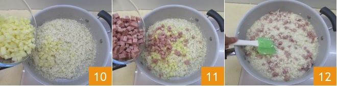 Quando estiver cozido, adicione os cubinhos de caciocavallo 10 e de mortadela 11, reservando cerca de 50 g de cada um para a guarnição dos pimentões. Misture bem o seu risoto 12