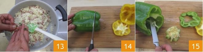 E perfume finalmente com as folhas de tomilho 13. Reserve o risoto e passe para a limpeza dos pimentões. Lave-os e corte a parte superior com o talo 14, depois esvazie os pimentões das sementes 15 para obter copinhos prontos para serem preenchidos. Coloque os pimentões assim esvaziados em uma assadeira, com a cavidade voltada para cima.