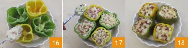 Agora, recheie os seus pimentões com o risoto 16 e distribua no topo os cubinhos de queijo e mortadela que você tinha reservado 17. Cozinhe os seus pimentões recheados em forno estático pré-aquecido a 200°C por 30 minutos. Cubra depois com uma folha de papel alumínio e cozinhe por mais 20 minutos (se utilizar forno ventilado, cozinhe a 180°C por cerca de 30 minutos, depois cubra com uma folha de papel alumínio e prossiga por mais 10 minutos). Retire do forno os seus pimentões recheados com arroz e saboreie-os junto com toda a família 18!