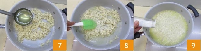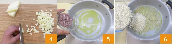 E depois em cubos 4. Aqueça o óleo em uma panela grande, coloque a cebola picada 5 e deixe refogar em fogo baixo por 5-6 minutos, até que fique quase transparente. Depois, adicione o arroz 6.
