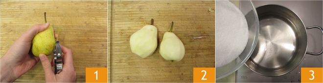 Para preparar as peras cozidas, comece descascando-as inteiras com um descascador 1, tomando cuidado para deixar o cabinho preso 2. Agora prepare o xarope: coloque na panela a água e o açúcar 3.