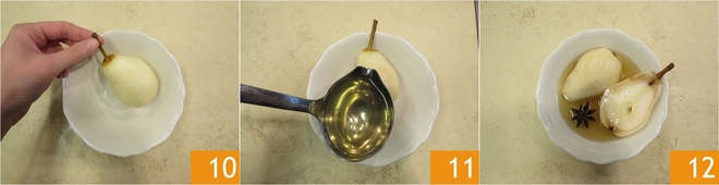 Agora monte: coloque uma pera em uma tigela pequena 10, despeje por cima uma concha de xarope 11 e sirva 12. Se preferir, pode adicionar uma pitada de canela em pó.
