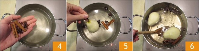 Adicione o anis e a canela 4 e leve à fervura. Assim que começar a ferver, abaixe o fogo e mantenha em temperatura média. Coloque as peras 5 e deixe cozinhar por 10/15 min, virando-as de vez em quando para que cozinhem de maneira uniforme 6.