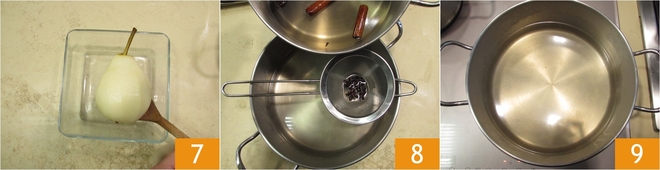 Quando estiverem prontas, retire-as do xarope 7 e reserve. Coe o xarope com uma peneira de malha fina 8, para separar os aromas 9.