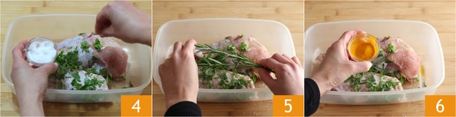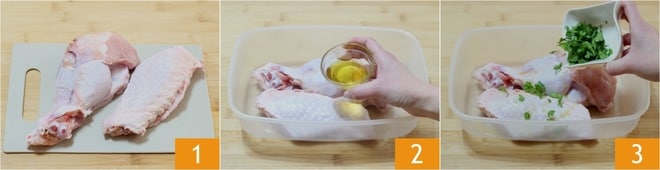 Para preparar o peru assado com batatas, corte em duas ou três partes a coxa de peru 1. Lave bem a carne e seque-a com um pano de prato. Coloque a carne em um recipiente não muito grande e tempere com óleo 2, a salsinha picada 3