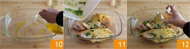 Unte uma assadeira 10, passado o tempo de marinada do peru, coloque-o na assadeira com a marinada 11. Tempere com o vinho 12.
