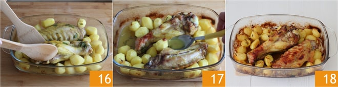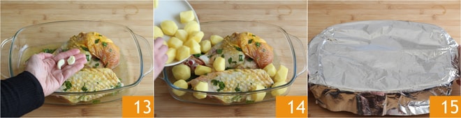 o alho descascado 13 e o óleo. Adicione também as batatas 14, cubra com uma folha de papel alumínio e asse a 200° em forno ventilado por 30 minutos.
