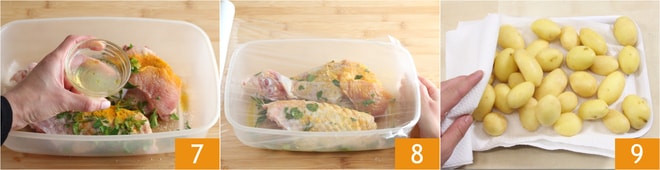 e o suco de limão 7. Misture tudo com as mãos para cobrir bem a carne com os aromas. Cubra com plástico filme 8 e deixe marinar por 1 hora. Enquanto isso, lave e descasque as batatas novas 9 e corte-as ao meio ou, se preferir, deixe-as inteiras.