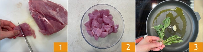 Para preparar o peito de peru na panela macio, a primeira coisa a fazer é cuidar da carne. Corte o peito de peru em pedaços de cerca de 2 cm 1 2. Em uma frigideira antiaderente bem quente, despeje o azeite, adicione o dente de alho, a sálvia e o alecrim 3.
