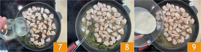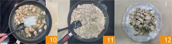Misture 10, cubra com uma tampa e deixe cozinhar por cerca de 10 minutos em fogo médio. Quando estiver macio e o molho cremoso 11, o peru estará pronto e você poderá servi-lo bem quente 12.