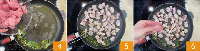 Deixe dourar em fogo baixo. Junte o peru 4 e deixe dourar também em fogo médio de ambos os lados 5, então salgue 6.