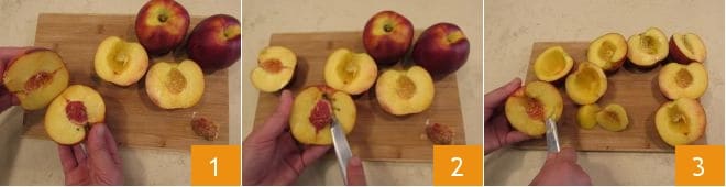 Para preparar os pêssegos recheados no forno, comece lavando e secando os pêssegos. Divida cada pêssego ao meio 1, depois, com uma faquinha, remova o caroço 2. Escave um pouco da polpa ao redor do buraco do caroço 3. Reserve os pêssegos.