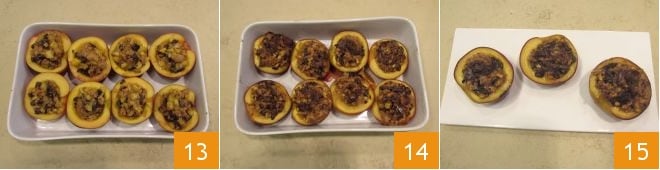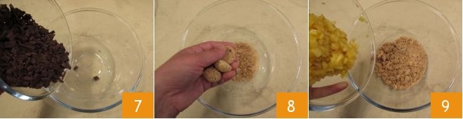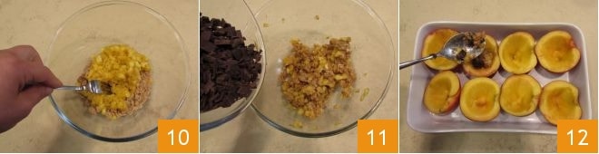 Misture os ingredientes 10 com a ajuda de um garfo. Em seguida, adicione também o chocolate 11 e misture este último aos ingredientes. Finalmente, coloque em uma assadeira levemente untada com manteiga os pêssegos, um ao lado do outro, com a cavidade voltada para cima, de preferência sem deixar espaços. Recheie-os com algumas colheres do recheio, dando ao recheio a forma de uma pequena cúpula 12.