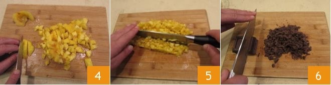 Agora dedique-se ao recheio: corte a polpa retirada dos pêssegos 4 e pique-a com uma faca 5 ou, alternativamente, use um mixer. Reserve. Pegue o chocolate e pique-o finamente 6.