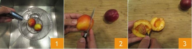 Para preparar os pêssegos caramelizados, comece aquecendo o forno estático a 180º, depois passe aos pêssegos: lave-os 1, corte-os ao meio 2 e retire o caroço, fazendo um corte com uma faquinha 3.
