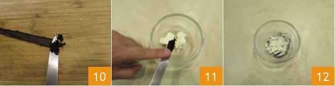 Enquanto o caramelo cozinha, coloque em uma tigela a manteiga em pedaços à temperatura ambiente. Em seguida, com uma faca, retire as sementes da ponta da fava de baunilha 10 e adicione-as à manteiga 11, mexendo tudo com uma colher para misturar bem 12.