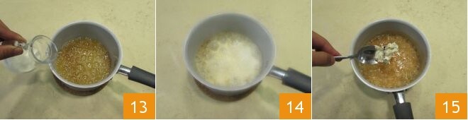 Quando o caramelo estiver com cor âmbar, tire a panela do fogo e, mexendo com um batedor, adicione o creme de leite aos poucos, sendo cuidadoso porque fará bastante espuma (13-14). Continue mexendo o creme de leite no caramelo, depois adicione também a manteiga aromatizada com a baunilha 15