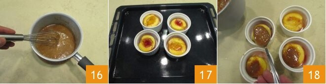 e misture bem até que todos os ingredientes estejam bem incorporados e o caramelo fique denso e encorpado 16. Enquanto isso, seus pêssegos estarão prontos: retire-os do forno 17 e despeje uma generosa colherada de caramelo em cada pêssego, diretamente em cada cocotte 18.