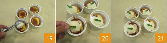 Adicione uma bola de sorvete do seu sabor preferido 19, decore com uma folhinha de hortelã 20 e sirva 21. Seus pêssegos caramelizados estão prontos para serem saboreados!
