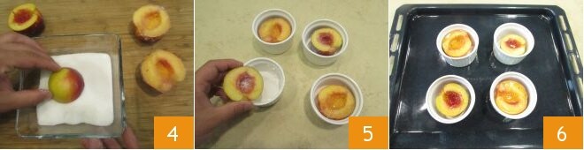 Molhe as metades dos pêssegos no açúcar, do lado da polpa 4, depois coloque-os em cocottes 5 e transfira-os para uma assadeira ou uma forma 6; então, asse-os no forno pré-aquecido a 180º por 25 minutos 6.