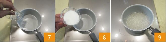 Enquanto isso, cuide do caramelo: em uma panela grande, coloque a água 7 e adicione o açúcar 8. Sem misturar, acenda o fogo e deixe a mistura de água e açúcar ferver 9 até obter uma cor âmbar.