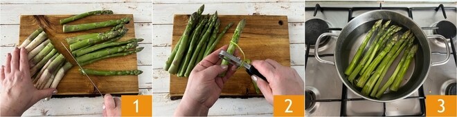 Para fazer o pesto de aspargos, comece pela limpeza. Elimine as extremidades mais lenhosas 1 e descasque a parte restante do talo, deixando as pontas intactas 2. No total, você precisará de cerca de 220 g de aspargos limpos. Escalde os aspargos em água salgada por cerca de 10 minutos 3.