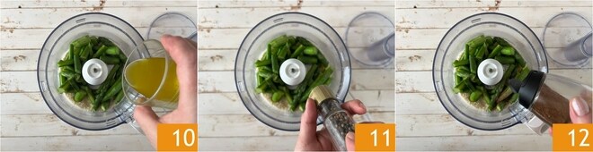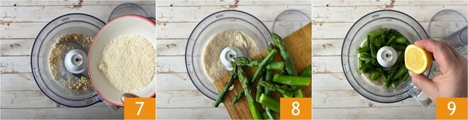 Adicione o Parmigiano Reggiano DOP e o Pecorino ralados 7 e bata novamente por alguns instantes. Agora adicione os aspargos 8 e algumas gotas de suco de limão 9.