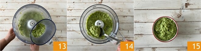 Feche o mixer e bata em pulsos 13, para não aquecer a mistura. Assim que obtiver uma consistência cremosa e rústica 14, o pesto de aspargos está pronto para usar 15.